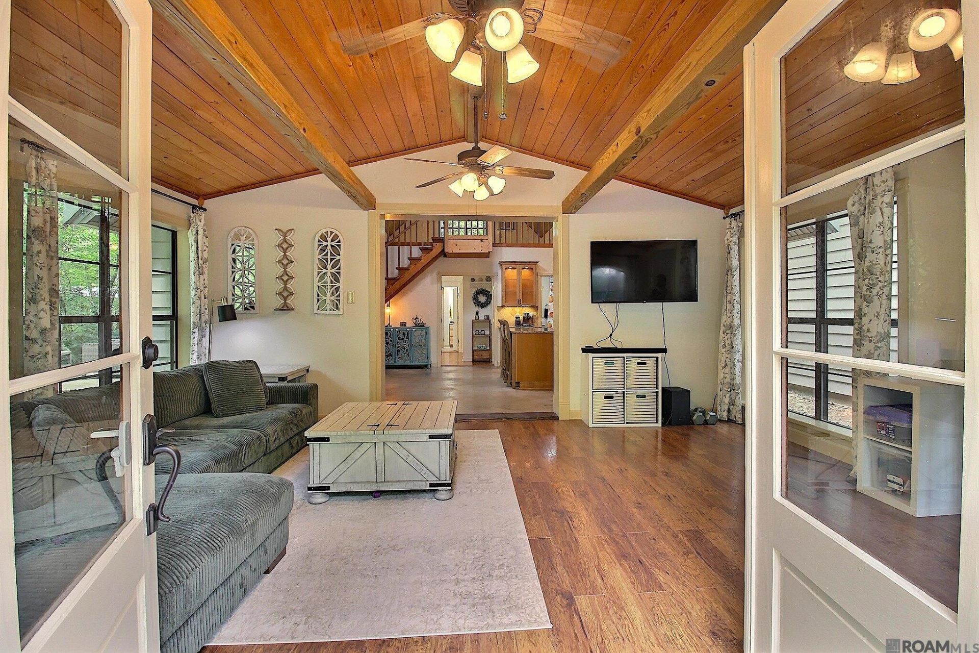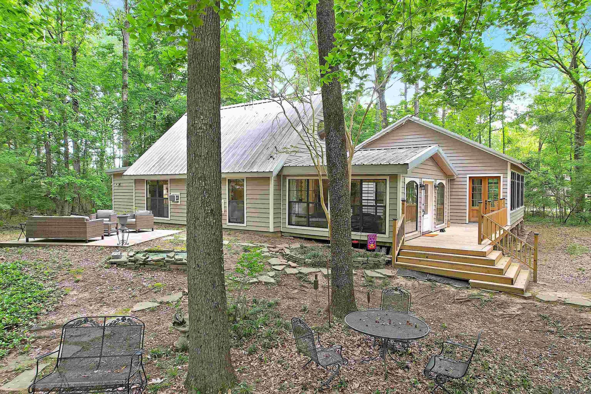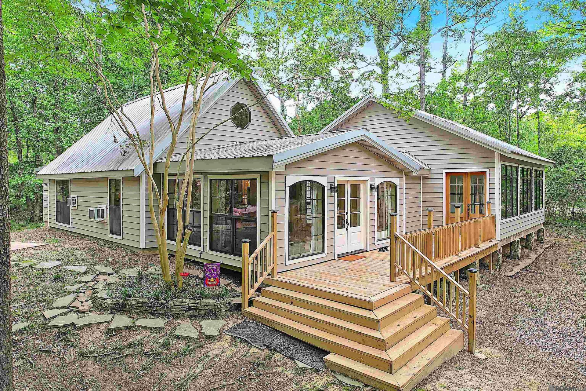 Set on 8 picturesque acres in the highly sought-after Slaughter school district, this charming cottage-style home offers the perfect blend of privacy, functionality, and country living. Surrounded by mature hardwoods with a peaceful, park-like feel, the property includes approximately 2 cleared acres along with additional wooded land ideal for recreation or hunting. A spacious front deck welcomes you in through French doors, opening to a warm and inviting living room featuring wood floors, cypress ceilings, exposed beams, and expansive windows that showcase sweeping views of the land. The open-concept kitchen and dining area is designed for gathering, with vaulted ceilings, granite countertops, a large island with storage, farmhouse-style cast iron sink, 5-burner gas range, and stainless steel appliances. Just off the kitchen, a full bath with laundry area includes a beautifully preserved antique cast iron tub with shower. A versatile loft overlooks the main living space?perfect for a fourth bedroom, home office, or bonus area. The primary suite offers generous space, a private en suite bath, and ample storage. Down the hall, accented by a stunning stained glass window, you'll find two additional bedrooms with soaring 10' ceilings, wood floors, and oversized closets. One of the bedrooms opens to a bright, airy sunroom with tall windows and 10' ceilings?an ideal space to enjoy morning coffee while taking in views of the surrounding wildlife. The sunroom also provides direct access to the front porch and deck. This property is built for a self-sufficient lifestyle, featuring mature fruit trees, raised garden beds, a 10'x14' chicken coop, and a brand-new 20'x30' metal shop with plenty of room for equipment, boats, or recreational storage. Surrounded by larger landowners, you'll enjoy added privacy and a truly quiet setting. If you've been searching for space, flexibility, and a peaceful place to call home, this one delivers!